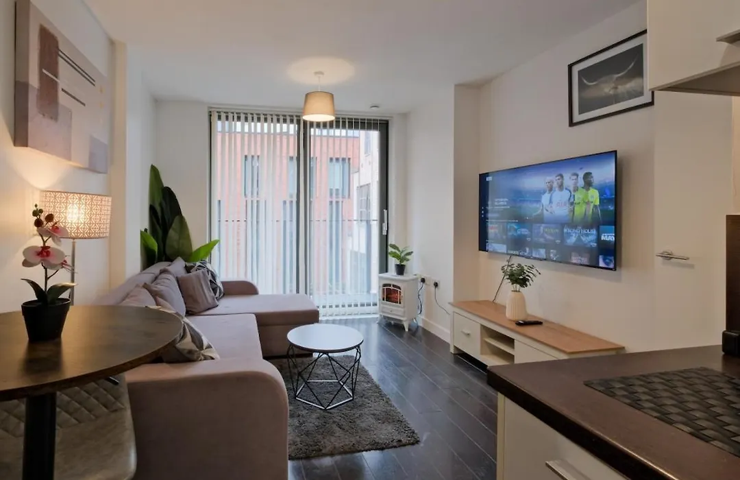 Im Modern 2 Bed Apartment With Balcony By Arndale Manchester, das lediglich 9 Gehminuten vom Fußball-Nationalmuseum entfernt liegt, können sich die Gäste auf einer Terrasse entspannen.